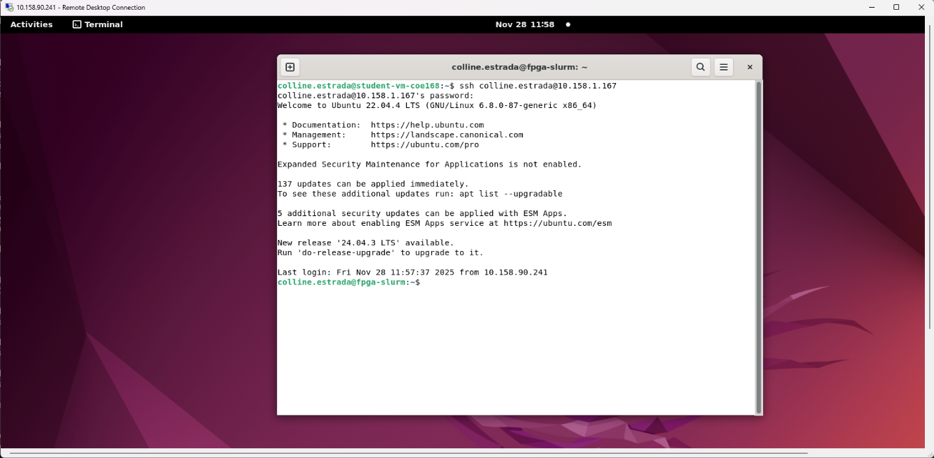 1. From your remote desktop connection (10.158.90.241), ssh to the FPGA server (10.158.1.167) using your EEE account credentials.